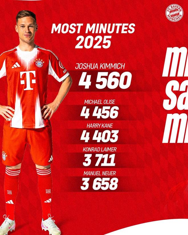 拜仁队内2025年度出场时间榜: